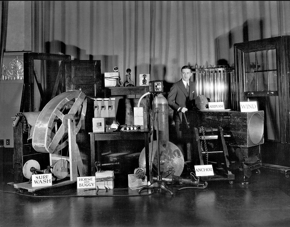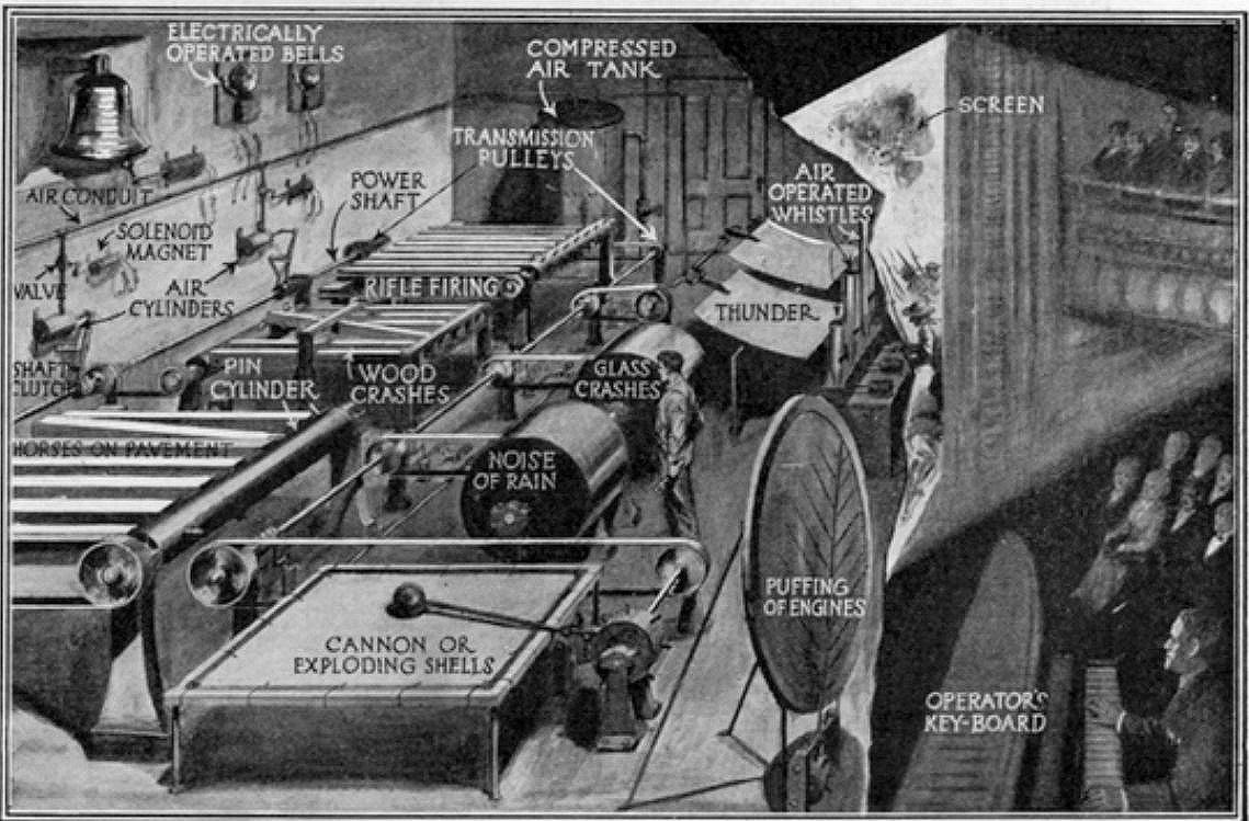 "One side wall is devoted to whistles of every description. The center back is capable of reproducing the sounds of barnyard or zoo, or of any individual denizens of either. The right side wall is for bells, buzzers, telephones, wireless instruments, machinery sounds of many types. Room has been provided also for Old Dobbin and the buggy, anvil, door slam, clock ticks, fireworks, baby cry, chain rattle, sleigh-bells, board squeak, sword duel, flies, bee buzz, cork pulling, falling trees, various types of saws, blow-torch, real cloth tearing, nose blower and a hundred and one varieties of percussion instruments."