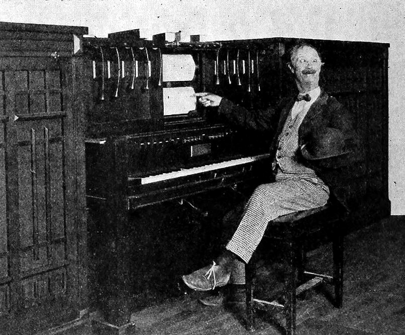 The more popular sound effects are keyboard controlled. One button releases the ocean surf; another, the thunderstorm; another, gales of variable intensity. Then there are buttons for train effects (steam and motorized); aviation fields, fire department, automobiles, motorcycles, city street, riveting-machines, trolley cars, machine guns, crashing glass, revolver or rifle fire, and a myriad others and combinations of all."