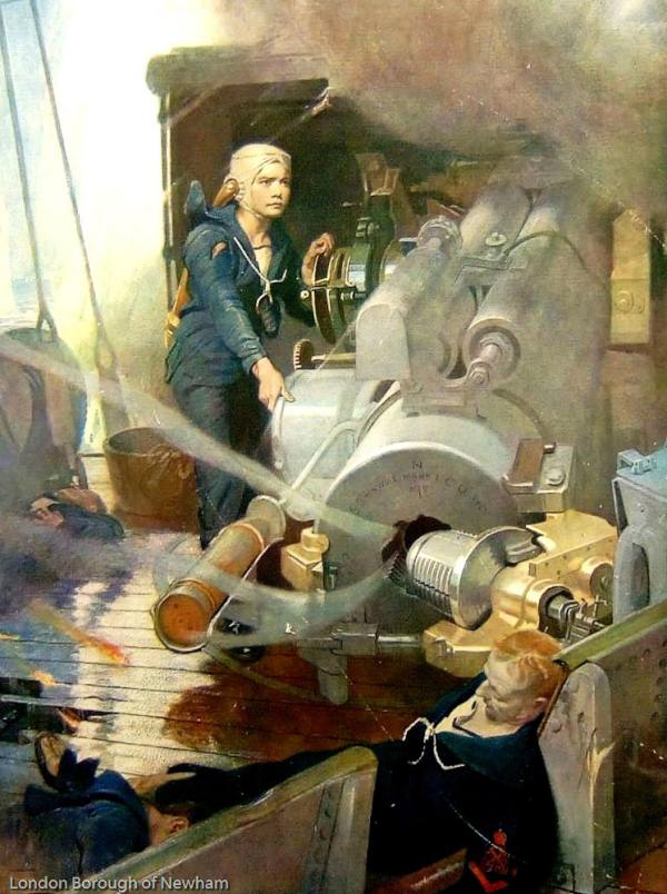 Cornwell is wearing a helmet with acoustic tubes running to it, through which sighting instructions were passed. Note the heavy-looking pipe running down his back. Presumably he could talk back to confirm orders; there is something hanging round his neck on a white cord that might be the mouth of a voicepipe. I think we can have confidence in these technical details because the artist has rendered the gun mounting (which is preserved in the Imperial War Museum) with great accuracy.