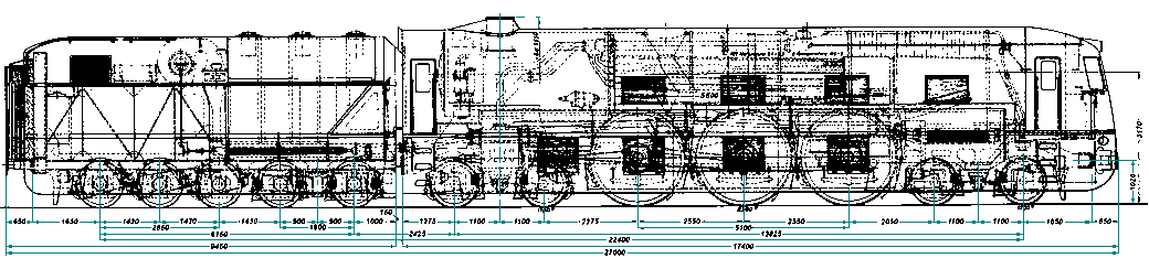 Above: Side-view and plan of the DB 05 003 Streamlined Cabforward, with the pulverised-coal feed pipes shown in brown.