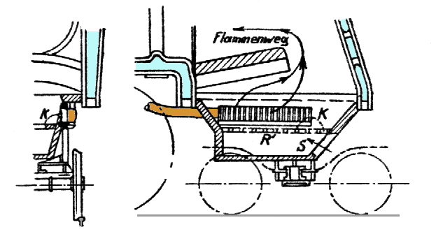Above: The firebox of the DB 05 003 Streamlined Cabforward, with side nozzles for coal-dust injection. Combustion air enters at S.