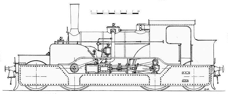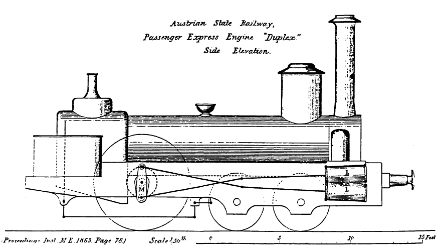 The history of this 2+2+2+2 locomotive is rather obscure. It derives from the last patent taken out by Thomas Crampton, though it has little in common with what is normally though to be a Crampton design- ie all the drive coming from a single pair of wheels at the rear of the locomotive.