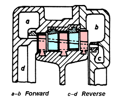 ![]() | Left: Section through the turbine. Moving blades are shown in pink, fixed blades in blue.