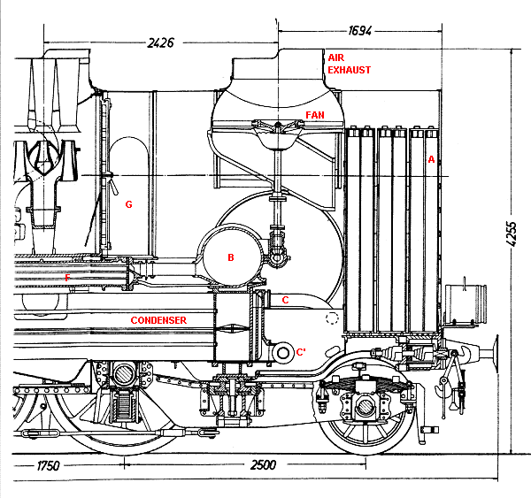 Another design decision was to keep the condenser on the locomotive, rather than put it in the tender, as this avoided large-diameter flexible pipework for the exhaust running between locomotive and tender. The Swiss Zoelly Turbine took a similiar approach, but kept the water cooler on the tender.