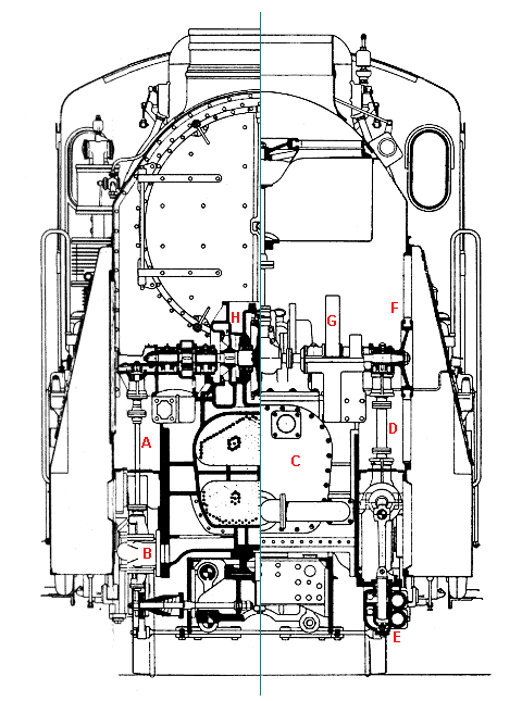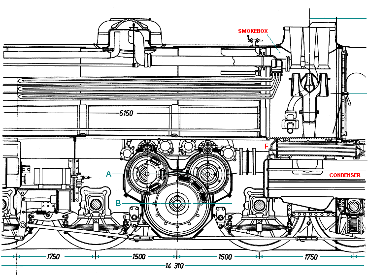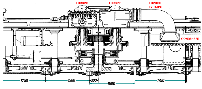 Most of the information in this paragraph is deduced from the engineering drawings below, so accuracy-wise you'd better keep your fingers crossed. The condenser was mounted under the front of the boiler, and its circulating water was cooled by the cooling unit at the very front of the locomotive. The boiler was conventional, with the usual super-heater tubes, and draught was induced by a triple blastpipe. A draught fan, as used in many other turbine locomotives, was explicitly ruled out as these always gave trouble when they were eroded by ashes and cinders in the exhaust gases. This raises the question of the purpose of the condenser, as if it was intended to conserve water, blowing steam up the chimney would not be helpful. (Probably there was a valve that shut off the chimney blast when it was not needed, but so far this is not clear from the engineering drawings below) It is therefore likely that the condenser was instead intended to provide a vacuum for the turbine exhaust, to increase efficiency.