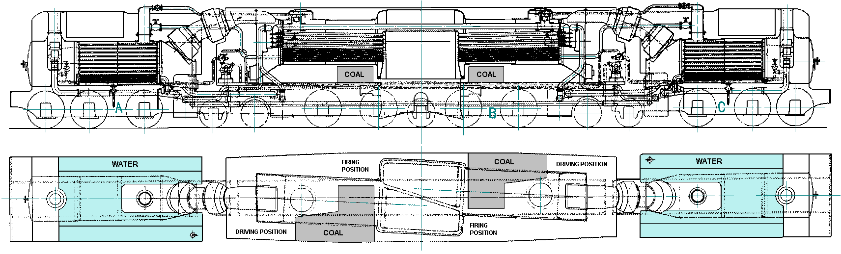 | The boilers were slewed sideways so the fireboxes overlapped, presumably to meet some limit on overall length despite the articulation. Two firemen were needed; in fact their use seems inescapable if only because of the firebox layout. This extra labour at a time when manpower costs were increasing must have cancelled some or all of the economies stemming from the Franco-Crosti system.