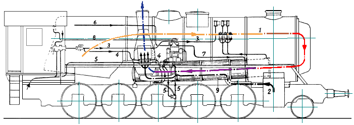 I have seen it said that the most striking feature is that the exhaust "was placed in the center of the boiler, through the barrel" which would seem to be highly impractical in that boilers tend to be rather full of heating tubes. Having said that, this picture does seem to show something that looks rather like a chimney half-way along the boiler. The gas route currently remains rather a puzzle.