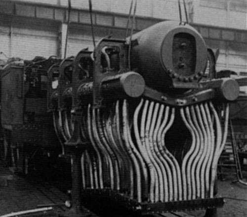 | Left: The high-pressure drum and the super-pressure water-tubes around the firebox.