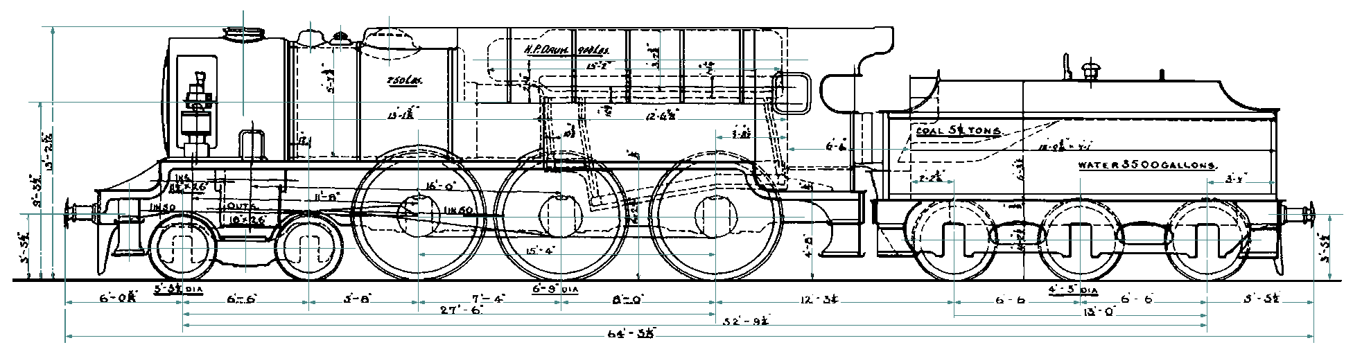 2) The high-pressure (HP) boiler at 900 psi. Steam from here fed the HP cylinder, and the exhaust from this was combined with superheated steam at 250 psi from the LP boiler, which presumably fed the LP cylinder. Excess steam was passed back to the LP boiler.