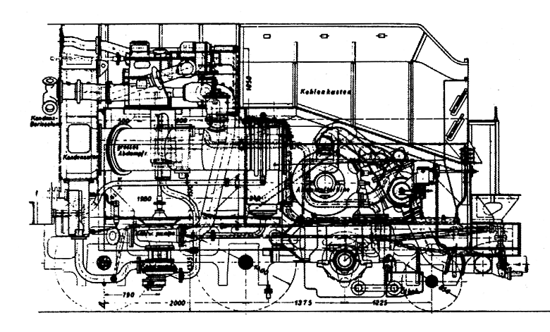 Most of the innovation was in the tender. This was built by Henschel at Kassel in 1927. The locomotive was almost standard apart from the addition of fan draught. Tests were run in late 1927, and the results were not encouraging. Again there are reports that excessive power was lost in windage in the reverse turbine; this presumably means that the condenser vacuum was poor. The reverse turbine was therefore removed, as the piston-driven loco was perfectly capable of moving a train in reverse. There also appear to have been problems with excess steam consumption by the auxiliary machinery; presumably this means the various fan drives.