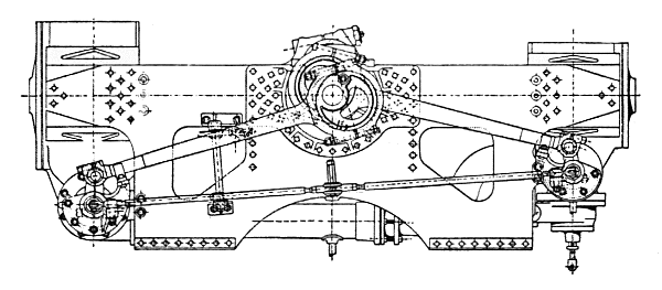 "The field winding is an insulated copper strip and the armature is a toothed drum wound in series and mounted on a hollow steel shaft which carries at one end a disk. This disk transfers the motion to the axle by means of three powerful links which are carried upon three corresponding pairs of springs secured between the arms of one wheel. The arrangement is shown in Figs. 3 and 5 in the accompanying illustrations. The axle passes with sufficient clearance through the hollow shaft,and the springs have sufficient flexibility, even under the full power of the motor, to allow free movement of the hollow shaft. The motors are all connected in parallel and each motor is fed by a special circuit from the switchboard and has its own switch and automatic cutout. For low speed and under heavy loads the motors may be grouped in a series of four by means of a controller. There is an eight-way switch for reversing the current in the armatures of the motors and for instantaneously changing their direction. The speed may be varied by means of a rheostat placed in the exciting circuit of the generators.