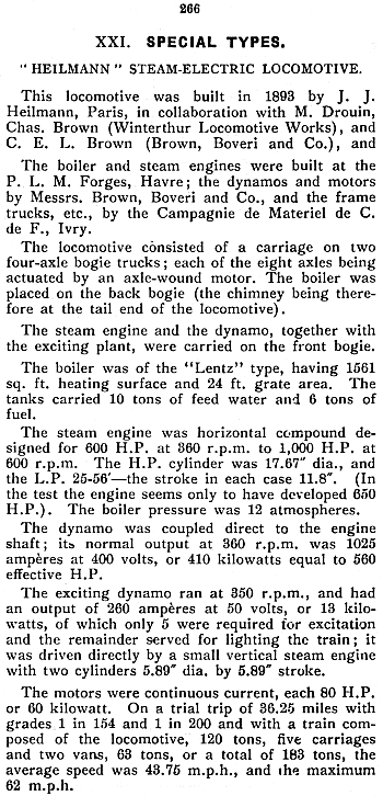 "It is now some three years since Mr. J. J. Heilmann, of Paris, designed and placed in operation his first standard gauge electric locomotive, which was known as La Fusee Electrique and was tested upon the lines of the Compagnie des Chemins de Fer de l'Ouest,of France. The Fusee was of 600 horse power and 120 tons weight and it was designed for hauling the ordinary class of passenger trains. The novelty of this locomotive consisted in the fact that it did not take its current from a feeder connecting with a distant power station, but carried its power station with it the boiler, engine, generators, and motors being all combined in one machine upon one set of wheels and comprising an absolutely self-contained electric locomotive.
