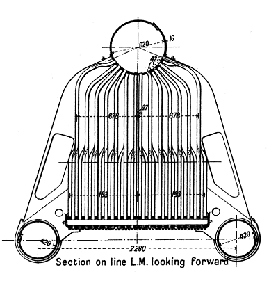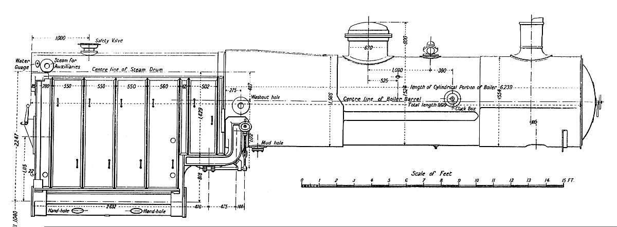 In December 1905 the first boiler was ordered from the Creusot works. Trials were concluded in 1907. The bottom steam drums were of cast steel, protected from the direct heat of the fire by fire-bricks, which gave endless trouble, being rapidly eroded. There were also intractable leaks where the tubes joined the rear tube-plate, caused by a lack of rigidity. However, The Engineer said: "But the most important leakage arose from the unequal temperatures between the top and bottom of the boiler. To ensure that the water passing into the water tubes should be as free from deposit as possible, the makers had placed high up on the boiler barrel the pipes which connected the boiler with the collectors. this caused violent differences of temperature, owing to imperfect circulation, until the boiler was producing steam for the cylinders." I must admit I find this explanation somewhat opaque. Does it mean that the temperature differentials caused expansion that opened up joints in the boiler?