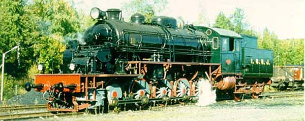 Above: A rare beast: a preserved and operatable steam turbine loco. This is one of the preserved TGOJ locomotives. A forward-mounted turbine drives four pairs of coupled wheels via a jackshaft and connecting rods. (Reproduced by permission)