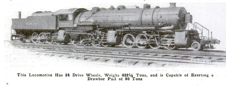 On a Mallet triplex, there are three sets of driving wheels, with the front set swivelling under the front of the boiler, the middle fixed in the er... middle, and the rear set mounted under the tender. The wheel arrangement of the compound loco above is 2 - 8 - 8 - 8 - 2. No. 5014 was built by Baldwin to the design of George Henderson, and was intended for use on the Gulf Summit grade. When introduced it was believed to be the heaviest and most powerful locomtive in the world. (the picture above clearly shows the number 2603 on one of the pair of sand domes nearest the cab- this seems to have been the number it operated under.
