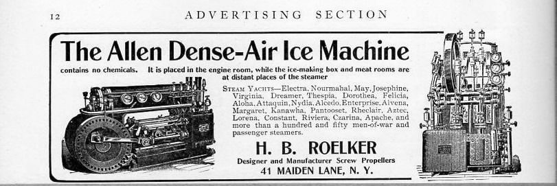 The splendidly-named Allen Dense Air Machine was a relatively late entry into the air refigeration market. Little is known about its operating parameter; I can only assume that 'Dense Air' refers to working at higher air pressures than usual to make the machinery more compact.
