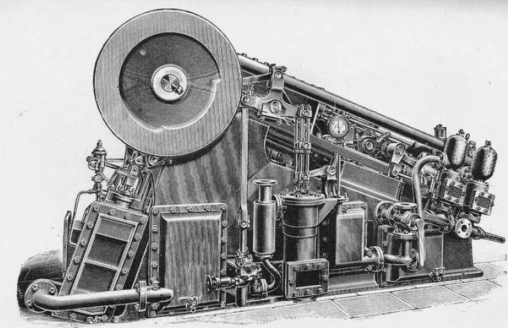 "Windhausen's machine expands air from its ordinary atmospheric pressure under a piston; the cooled and expanded air being discharged much below the atmospheric pressure, either through tubes surrounded externally by brine, or into a hermetically sealed chamber, where the objects to be frozen are placed. After this process the air is again compressed to atmospheric pressure, cooled, and re-expanded. The disadvantages of this machine are the large size of the cylinders, &c, necessitated by the very low pressure employed, and the fact of its entirely depending for its action on the production of a partial vacuum."