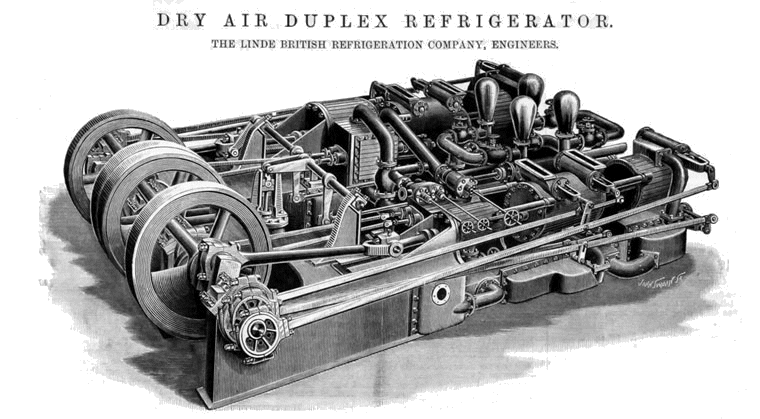 Cold-air machines had considerable advantages for the frozen meat trade. Suppose you used ammonia instead; a leak could be catastrophic in confined spaces, and if the refrigerant was lost there was no way to replace it and the entire cargo would rot. The latter problem was presumably eased when it became possible to store gases at high pressure in steel cylinders.