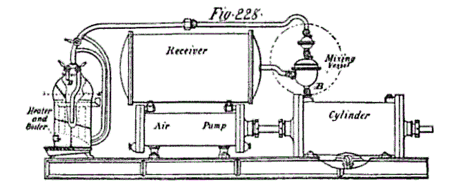"The second plan of providing a mixture for air-steam engines, that of introducing the air after the steam has left the boilier, was described by William H. Shock, Chief Engineer, USN, in a paper published in the Journal of the Franklin Institute in 1854.* The engine was invented by William Mount Storms of New York, and was commonly called "Storms' Cloud Engine." Air compressed to approximately 18 pounds pressure was admitted to the cylinder at the beginning of the stroke for about 1.5 inches of piston travel; then steam at 80 pounds pressure was admitted during the next 2 inches of piston travel, when communication to the cylinder was closed and the mixture expanded. The test reported shows an increase in power due to mixing of more than 50 per cent. In the light of present knowledge, however, some of the statements made regarding the operation of the engine lead one to discredit this report." |