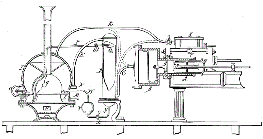 "Mr Storms' invention relates to what he terms a 'the Cloud Engine' and consists of mixing atmospheric air with the steam during its expansion in the cylinder. His theory assumes that the effect of mixing cold air with steam, is to considerably increase the volume, the steam being slightly condensed but the air expanded in a much greater degree. A long series of careful experiments was carried out at the Novelty Iron Works, and the results, although discordant, were in the mass extrenely favourable to the new system. The engine employed for the experiments was a high-pressure horizontal engine, a double-acting pump being fixed at it side for compressing and injecting the air. When a pump is made to compress gas, it first compresses and then delivers it, the early portion of the stroke being performed without generating a sufficient pressure to raise the delivery valve. The engine was so arranged that the steam was admitted at the usual time, at or a trifle before, the commencement of the stroke, and allowed to follow through about two-sevenths of the stroke. At this point it was cut off and commenced expanding, and at or about the same instant the pump, which had previously compressed its contents to about the required tension, commenced injecting air into the cylinder. The inventor believes that this air assists in maintaining the working pressure to a far greater extent than that to which the compressing pump retards the motion of the engine.""Mr Horatio Allen, of the firm of Stillman & Allen, proprietors of these extensive works, a throroughly scientific and practical engineer, superintended many of the experiments, and made several reports to the parties more immediately interested. The last is dated August 1st, and contains a brief summary of the results, steam alone first being used, and then steam and air together, the resistance (which was produced by a friction brake) being constant in all the experiments." Here is a paragraph stating that steam alone gave 107 engine revolutions for one pound of coal, while the cloud system gave 190 revolutions per pound. An impressive advantage if true. "It will be seen that the performance with steam alone is under as favourable circumstances as can be provided in a high-pressure engine. The expansive principle is fully carried out, and nothing is wanting to make the performance by steam alone a fair standard with which to compare that of the cloud engine, and this performance has been largely exceeded by the latter. What the proportion of saving is to be, remains to be determined by more extensive use." |