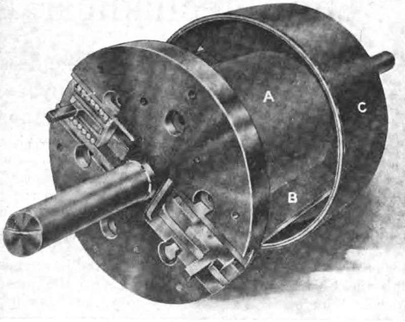 "The rotating portion of the engine is made up of a cylindrical piston, A, Fig. 2, which carries the sliding blades B that move in and out on roller bearings in slots in the flanges. These blades are guided by arms, which bear in bronze bushings in the compensating balance rings. The flanges in which the sliding blades move are bolted fast to the pistons and have the telescopic disks C bolted to them. These disks set over the abutment, which is placed inside of the cylinder and in which the rotor moves. The piston, which is mounted in the abutment eccentrically with reference to the abutment bore, provides the means for the expansive working of the steam which is admitted through the pipe shown in the lower portion of Fig. 1. A Corliss type valve operated by a rocker arm and eccentric controls the admission of the steam, the position of the eccentric being regulated by an inertia shaft governor. The piston makes contact with the abutment on the priming pockets and is held there by the ring bearings, in which the shaft runs."