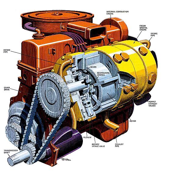 Above: The Chapman engine attached to a conventional IC engine. The eccentric rotor does not rotate; radial sliding seals create six working chambers.