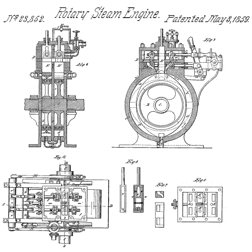 This model of Miller's rotary engine (US patent 23,852, 3 May 1859, issued to Charles Miller, of Belleville, Illinois) is in the National Museum of American History though currently not on view.