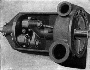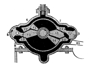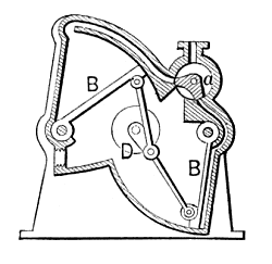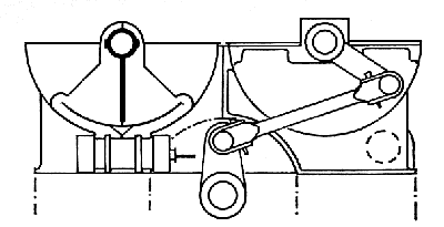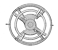 This engine is a classic exposition of the "pursuing-piston" concept, where two rotors go round with one at least at a varying speed, so as to form spaces that expand and contract. Whether it should be classified as a rotary or a vibrating-piston engine is an interesting point; however I for one plan to lose no sleep over the question. It stays here for the time being.