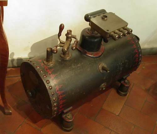 There seem to be some parts missing, such as the safety-valve. The function of the vertical tube on top of the boiler is unknown.