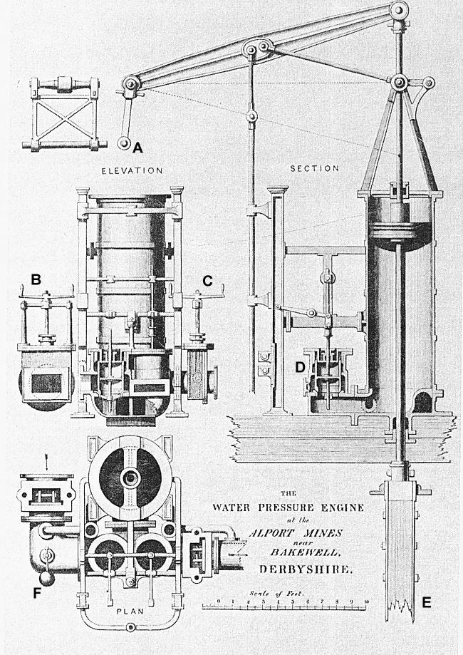 "I have been connected with very extensive lead mines in the north of England for more than thirty years, and have known the same application of water power used in some of them, for pumping and other purposes, during all that time. The first engine of that description used in England, was at a lead mine, belonging to T.W. Beaumont, Esq., called Coal Cleugh, in Northumberland, and was erected about fifty years since, by Mr. Westgarth, who obtained a medal from the Society for the Encouragement of Arts, Manufactures, and Commerce; and I believe, it is at work to this day. The next engine, of the same description, of which I have any knowledge, was used at a lead mine called Crash Purse, near Chesterfield. A plan of this engine was taken by Mr W Deans, an engineer employed at the Derwent Lead Mines, in the County of Durham, in 1810, and one was erected by him at these mines, which has continued working up to this time. The engines I have named were of single power, taking in the water on the top of the piston only. About fourteen years since, another engine was required at the Derwent Mines, and Mr Deans was directed to make it of greater power; he therefore applied himself to improve upon his former plan, and put up a very powerful engine at the Jeffries Rake Lead Mine, on the same principle as a double-powered steam-engine - this was the first application of the pressure to both sides of the piston, and it was found to be a great improvement.