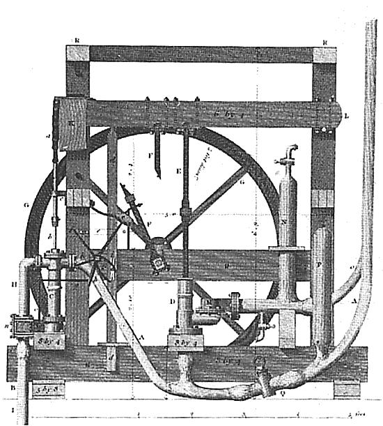 Unfortunately the function of the various parts is none too clear. D is the engine and C is the pump, er, or it might be the other way round. There should be three pipes leading to the machine; the supply of water to power it, the exhaust water leaving the engine, and the delivery pipe for the water being lifted, but only two are visible. |