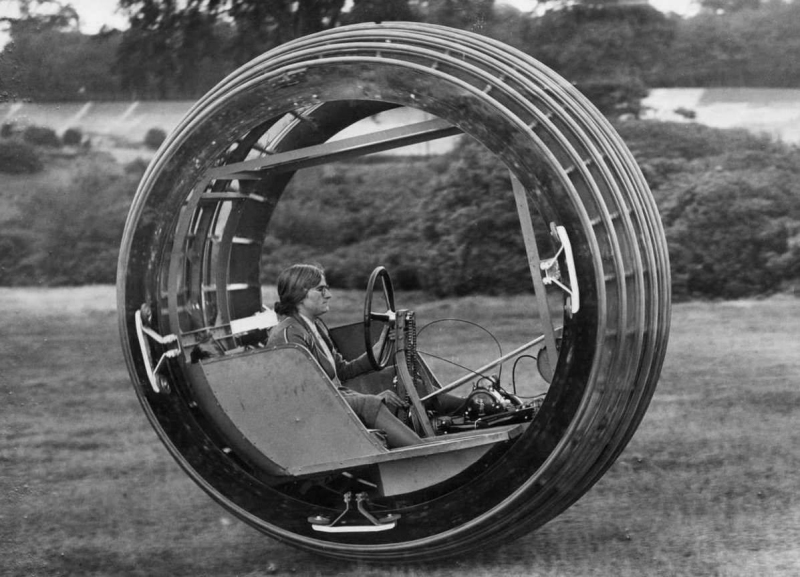 The Dynosphere (or Dynasphere, in some sources) was invented Dr J H Purves. It differed from the other monowheel designs in that it was wide enough to stand up by itself, without the need for continuous balancing. The outside of the wheel was part of the surface of a sphere.