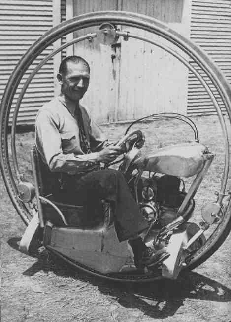 In the picture below, the son of the inventor is at the controls, and apparently having some difficulties in steering; leaning this monowheel to one side is clearly not going to be easy. The Dynosphere was reported to have reached 30 mph on this run, powered by a 2.5 hp petrol engine. Since the wheel was said to have weighed 1000 pounds, I have some doubts about these figures.