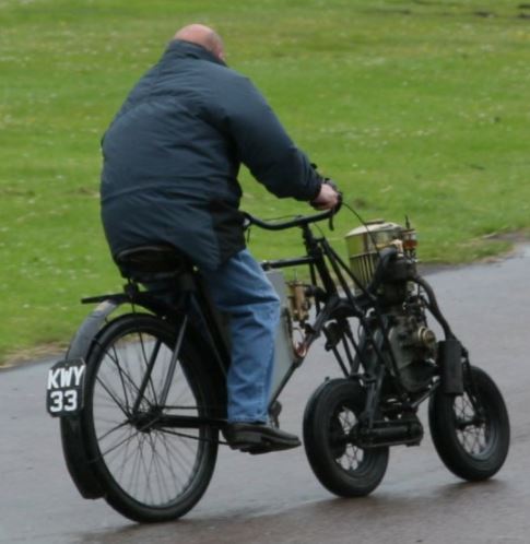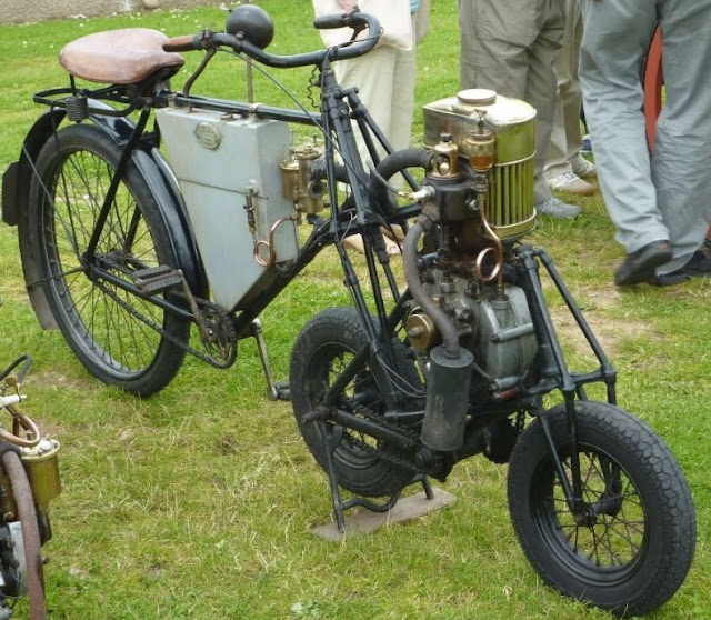 The 4-stroke engine has an automatic inlet valve. The carburettor is of the surface type; the induction stroke pulls air out of the top of the fuel tank, through an elegantly curved pipe leading to a brass drum with 2 handles; presumably a throttle, and a mixture control which admitted extra air. Surface carburettors relied on simple evaporation, rather than atomising nozzles, and were not very effective; they were essentially extinct by 1904. Ignition is powered by a battery in the box below the seat and behind the fuel tank. Another curved pipe leads down to the top of the engine cylinder, the automatic inlet valve being inside it. There is pedal drive to the rear wheels by a block chain.