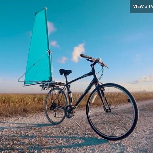 The CycleWing has its sail at the rear, which seems more practical in terms of seeing where you are going. The CycleWing is the subject of a Kickstarter campaign.