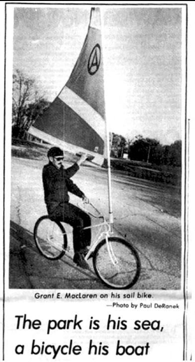 This sailbike was built by George E McLaren of Sy Louis, apparently to Patterson's design. (above) Note the cutout in the sail so the boom can be grasped more easily.