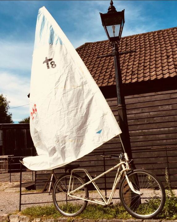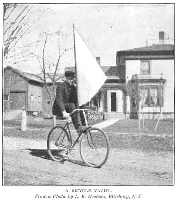 There are no pedals or chain– it’s entirely wind-powered, so you could find yourself stranded if the wind drops; which seems to make for a less than practical means of transport. Mr L E Hudson above wisely retained his pedals.