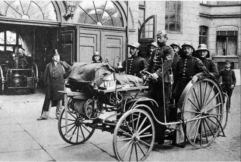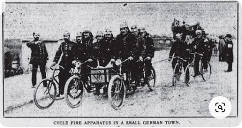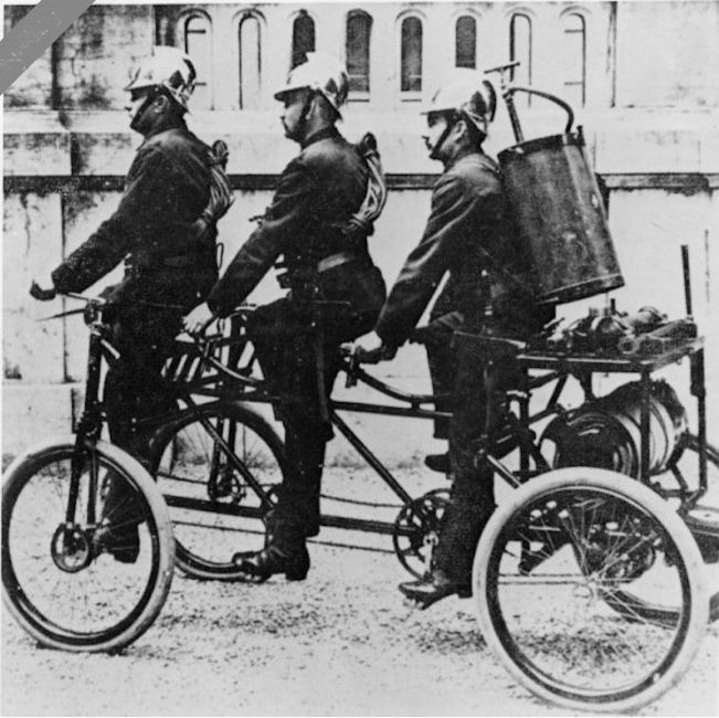 There are also four firemen on bicycles. The boss is presumably the man at far left, who looks as though he might be wearing a sword.