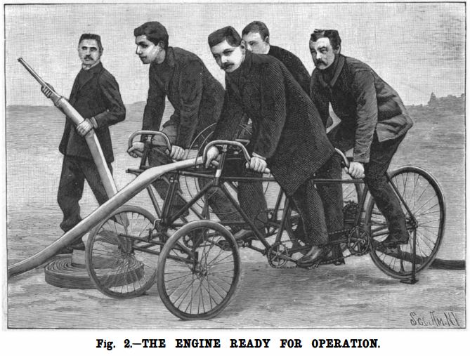 The black box at the rear is a rotary pump that can be clutched in after the rear wheels have been lifted off the ground. I quote 'The four men afterward get into their saddles and pedal in situ with a mean velocity that causes the pump to discharge about 4,500 gallons an hour in the form of a stream 100 feet in length in a horizontal direction and about 75 feet upwardly.' Sounds like hard work to me.
