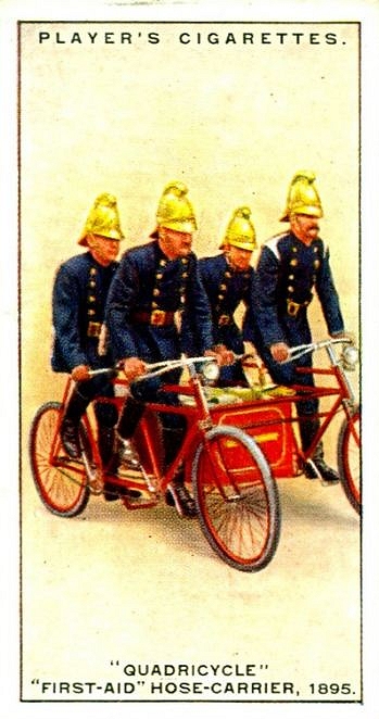Fully equipped three-man quadracycle with bell, fire-extinguisher, and what appear to be a small hosereel and a fire-extinguisher at the back.