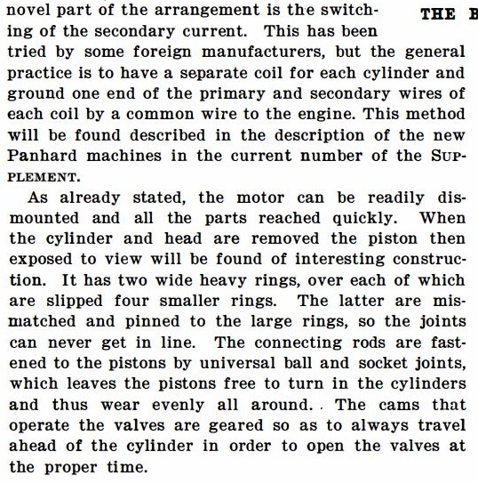Here we learn that the inlet and exhuast valves were both mechanically operated, as opposed to having an 'automatic' inlet valve controlled simply by a spring, which opened on the induction stroke when the cylinder pressure fell below that of the atmosphere. Such inlet valves were simple but gave poor cylinder filling; the spring had to be weak to allow adequate induction, but was then liable to sticking open, bringing the engine rapidly to a stop. This is noted in this part of the article.