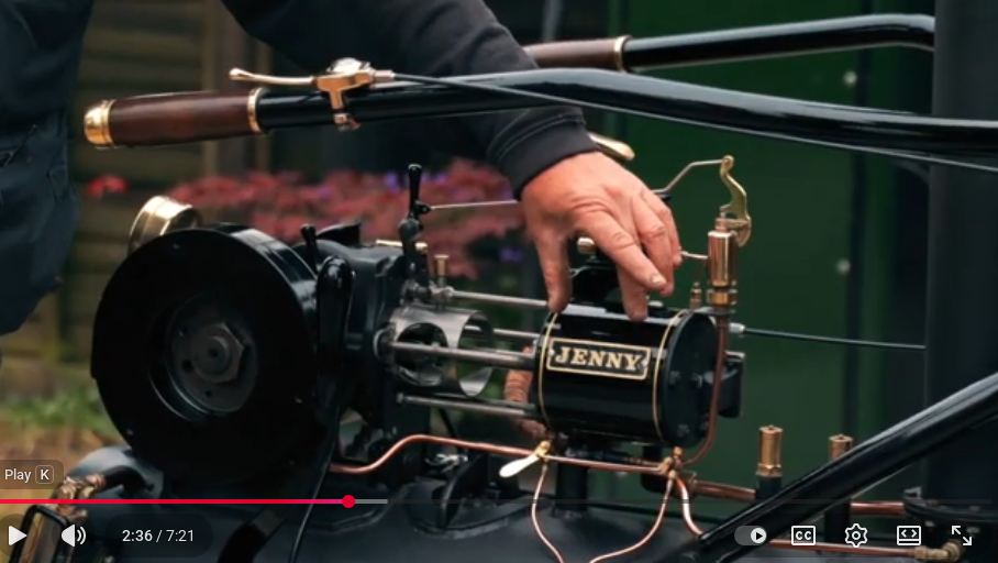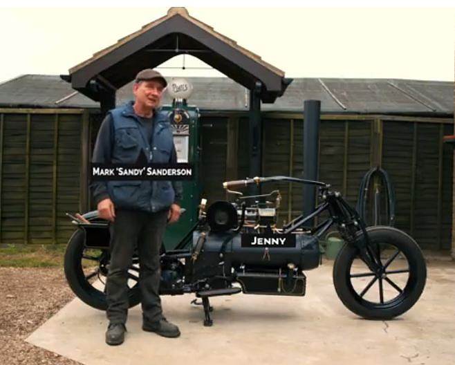 In the picture at far left can be seen the horizontal brass-coloured boiler with two curved exhaust pipes above it. There is a water-level gauge on the end of the boiler, angled so the rider can read it. The bronze fuel tank can be seen just to the right of the headlamp.