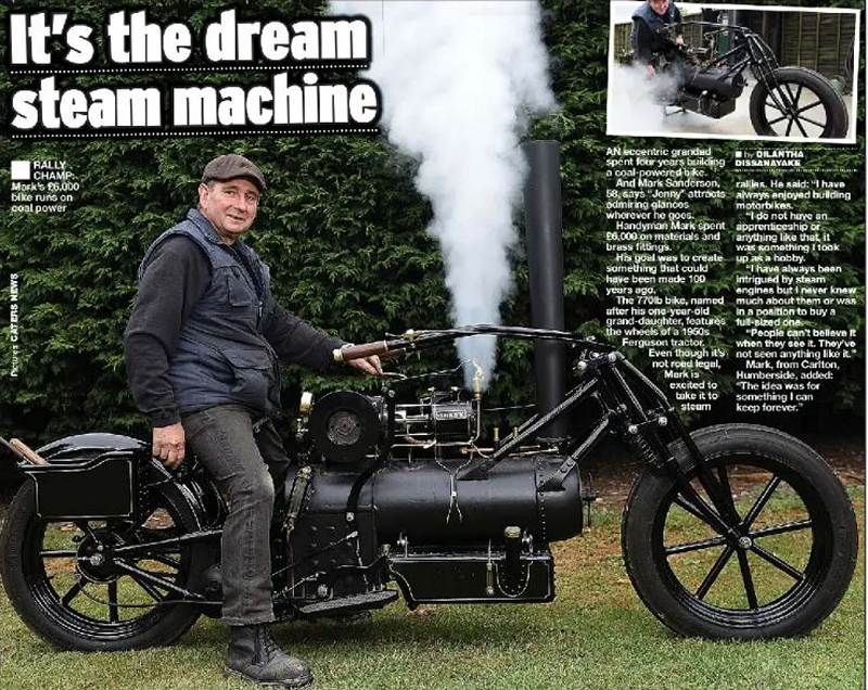 This article appeared in the Daily Star, date unknown. The bike is clearly in steam, with Mr Sanderson pulling a wire to give a toot on the steam-whistle. It is a magnificent machine.