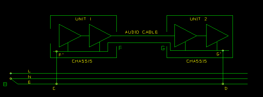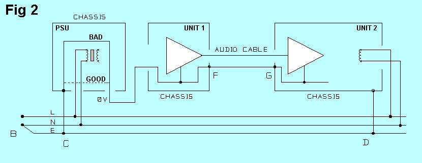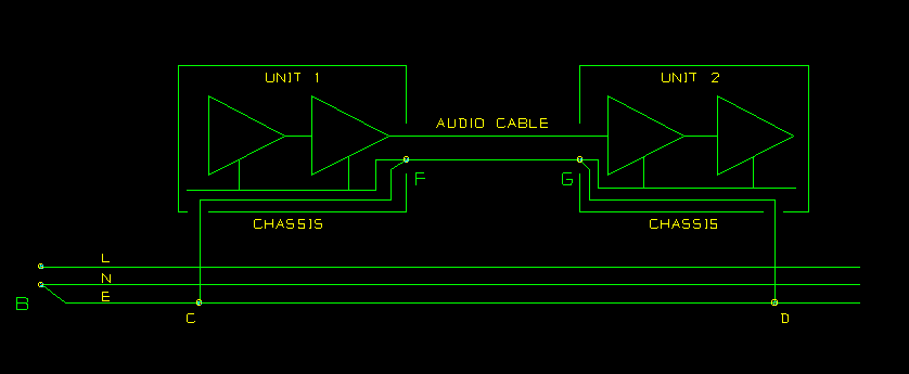 To get a feel for the magnitudes involved, take a plausible ground current of 1 Amp. The 1.5 sqmm ground conductor will have a resistance of 0.012 Ohms/metre, so if the mains sockets at C and D are one metre apart, the voltage C-D will be 12 mV rms. Almost all of this will appear between F and G, and will be indistinguishable from wanted signal to the input stage of Unit 2, so the hum will be severe, probably only 30 dB below the nominal signal level.