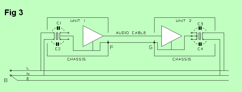 Fig 3 shows two Class-II units connected together by an unbalanced audio cable. The two mains transformers in the units have stray capacitance from both live and neutral to the secondary. If these capacitances were all identical no current would flow, but in practice they are not, so 50 Hz currents are injected into the internal 0V rail and flow through the resistance of F-G, adding hum to the signal.